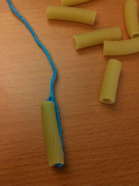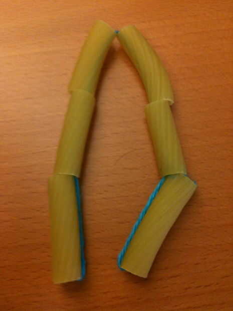 Ahora, toma cada tentáculo y cuelgue el arnés con un número desigual de rigatoni en cada lado (por ejemplo, tres en un lado y cuatro en el otro) y luego envolver la hebra alrededor de la silla un par de veces para que no pop apagado mientras está saltando hacia arriba y hacia abajo en la línea de la película.