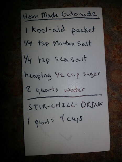 Esta es la manera que he encontrado como hacer una casera bebida de los deportes. Por supuesto no va a gusto exactamente como gatorade o powerade, pero aún así buen gusto y tiene electrolitos. El sabor dependerá del tipo de kool-aid que usa. Lo cool de esto es que no tengo que ir a buscar nada tenía todo alrededor de la casa. La receta es bastante sencillo, la cantidad que estoy haciendo escuchar se llena un vaso de 32 oz y una jarra de 20 oz. 2 cuartos de galón. Necesitas Tazas medidoras para esto. Asegura de dejar enfriar antes de beber hace gusto mejor frío. Si usted necesita algo de beber además de agua y no quiere salir de su casa esto es grande para eso. Podría añadir cubitos de hielo tu no quieres esperar.