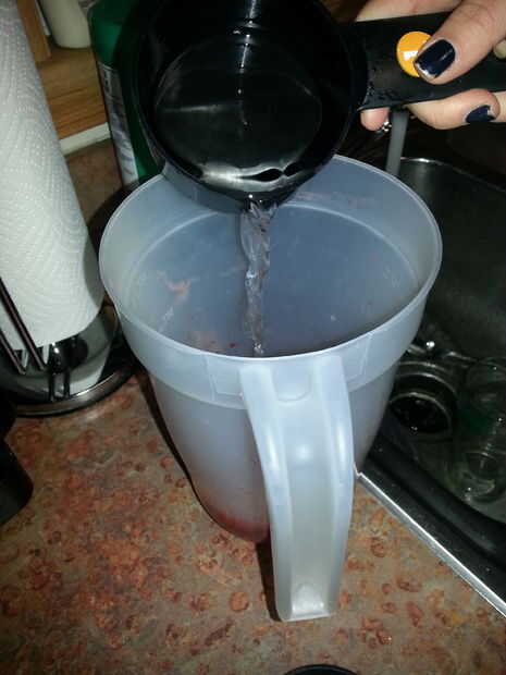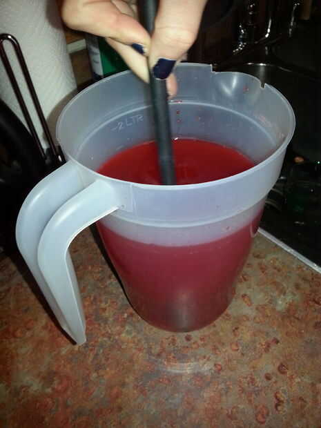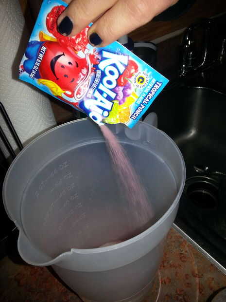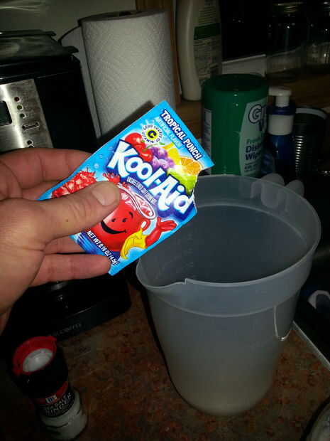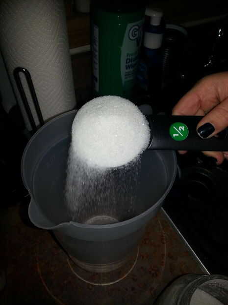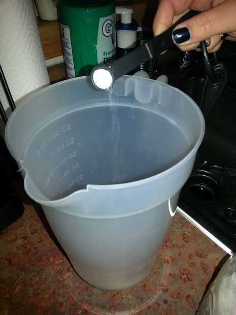 Empecé con mezcla todos los polvos juntos en una jarra. Rectificado por la sal del mar lo mejor que pude para hacer se encajo en la cucharilla de 1/4 mejor. Agregar el agua última y revolver. Dejar reposar un minuto y revuelva otra vez poner en la nevera y deje que se enfría. Lo pongo en botellas de bebidas de deportes vacía por lo que se vería como una bebida para deportistas. Hay otras recetas para hacer esto.
