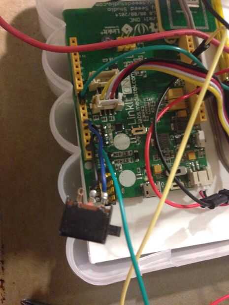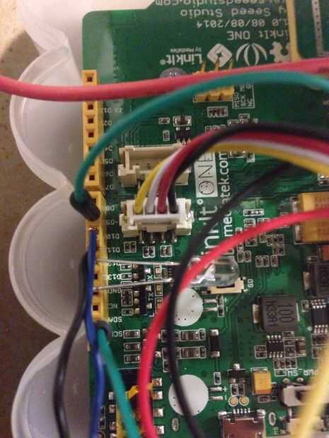 El termómetro exterior y sensor de humedad requieren una fuente de alimentación de 5 voltios y tierra a la Junta de LinkIt y datos separados mangueras de retorno. La temperatura y la humedad se devuelven como señales analógicas a los pines analógicos 1 y 2. El sensor de 9 ejes está conectado al puerto de grove en el LinkItOne y la antena del GPS y la batería están conectados a sus puertos correspondientes.
