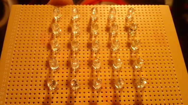 Paso 1: Soldar los 25 LEDs en la placa que lleva puede funcionar verticalmente para tierra y horizontalmente para positivo (ver imágenes)