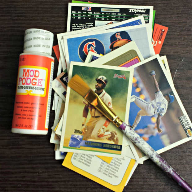 Compró una librería barata por unos pocos centavos y quiso transformar en una librería bonita para la habitación de un niño. Empecé con una botella de Modge Podge y una pila de tarjetas de béisbol. Los fanáticos del béisbol no se desesperen, la mayoría de las tarjetas era de 1993, el año más inútil de la recogida de la tarjeta!