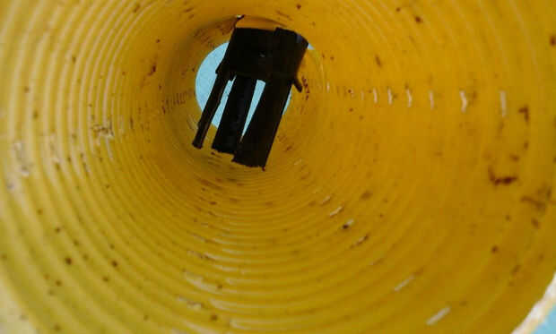 Usé una sierra para metales y par de tijeras pero podría utilizar un cuchillo o elemento similar para hacer la siguiente parte. Corte un agujero en el tubo amarillo bien el diámetro de la tubería negra y cortar rodajas del extremo del tubo negro. Finalmente cortar un agujero en cada cubo para encajar el tubo amarillo, para mí era del tamaño de un agujero de ratón de dibujos animados.