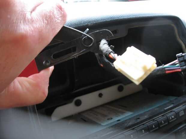 Después de quitar el reloj, no olvide también el conector que une el reloj con el arnés de cableado del coche. Más tarde necesitaremos ese conector para el reloj de la energía. Retire el conector del mazo de cables con cortador de alambre y deje un poco alambre en el conector para conectar una fuente de energía más fácil más adelante en.