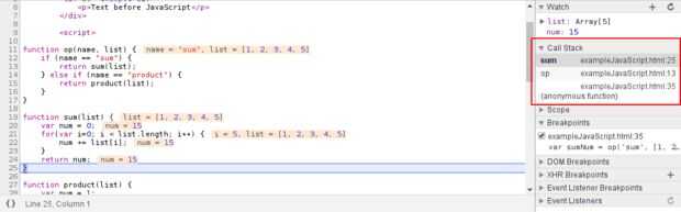 La última funcionalidad del depurador cromo tratará este Instructable es el panel de la pila de llamada. Se encuentra entre el panel del reloj y el panel de alcance. La pila de llamadas es la lista de funciones que se llaman ahora. En este punto en la ejecución de la página, el navegador llama la función de "op" y al llamar, ha llamado a la función "suma". Si selecciona una función en la pila de llamadas, puede ver las expresiones de reloj y ámbito local de la función en el momento que llama la función siguiente.