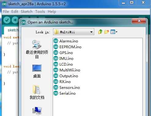 Aquí utilizamos la versión del programa es de 2,2 y elija para abrir MultWii.ion. Después de la apertura, usted verá algunos texto de código fuente, es necesario modificar onfig.h principalmente