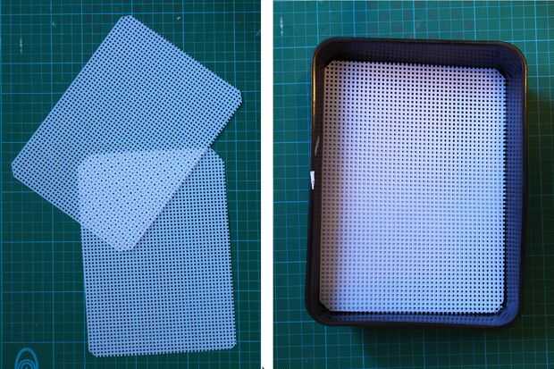 1. cortar la lona plástica que hace punto a la medida con unas tijeras ordinarias. Hacer para que se ajuste cómodamente en la parte inferior de una de las bandejas plásticas.