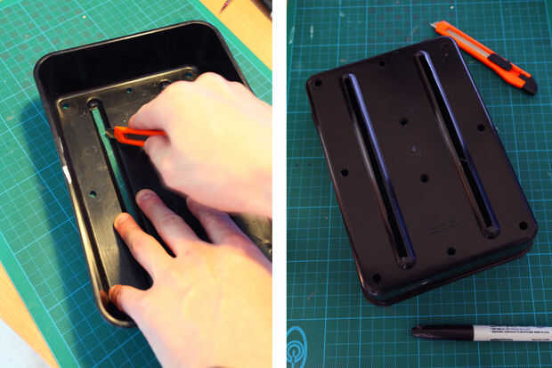 2. Busque en la parte posterior de la bandeja de plástico y ver si hay cualquier ranuras que podría sentarse la bandeja. Si es así corta éstos hacia fuera con un cuchillo Stanley. Usted debe dejar con una bandeja con dos ranuras limpias por la parte trasera. Estas son donde resaltarán las aletas de disipador de calor de.