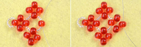 2 º, agregar 3 de semilla de granos a cada cable, cruza ambos hilos a través de un cordón rojo y apriete, añadir grano 1seed a cada cable, cruza ambos hilos a través de un cordón rojo y apriete, es el patrón de abalorios básico;