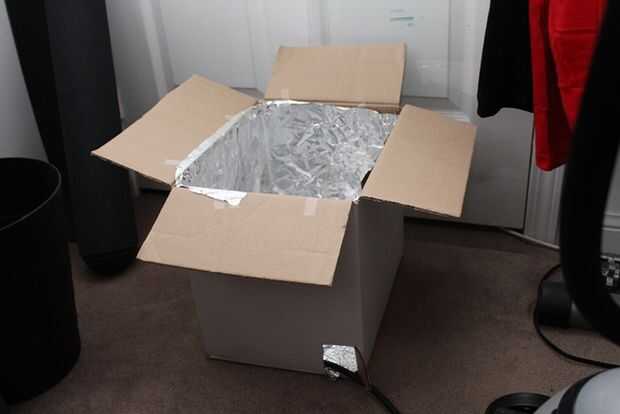 - Cubrir el interior paredes y fondo de la caja con papel de estaño, esto refleja y difunde la luz en la imagen.