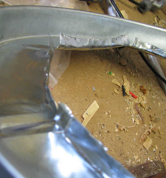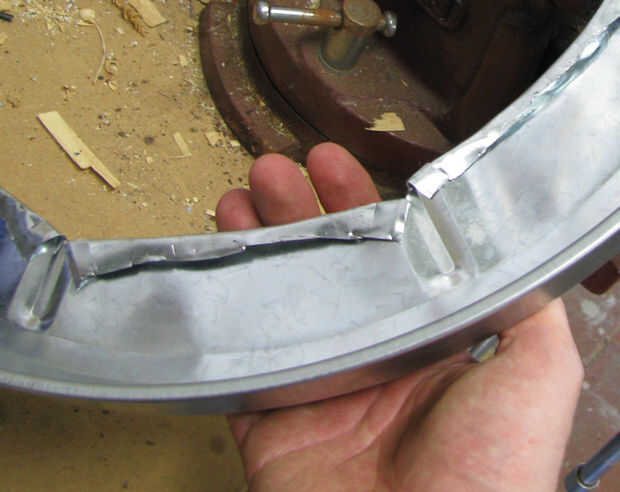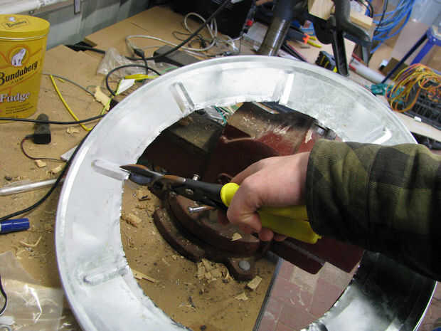 3) cortar un agujero grande, dejando sólo una o dos pulgadas de metal en el borde. Uso de tijeras para hacer esto y usar guantes.