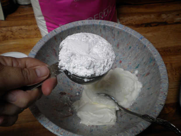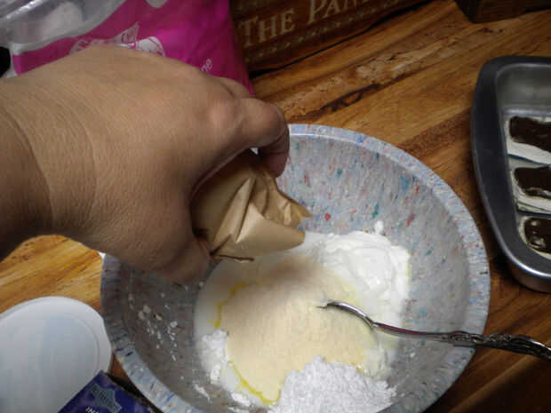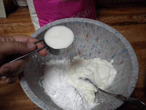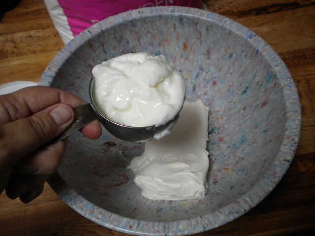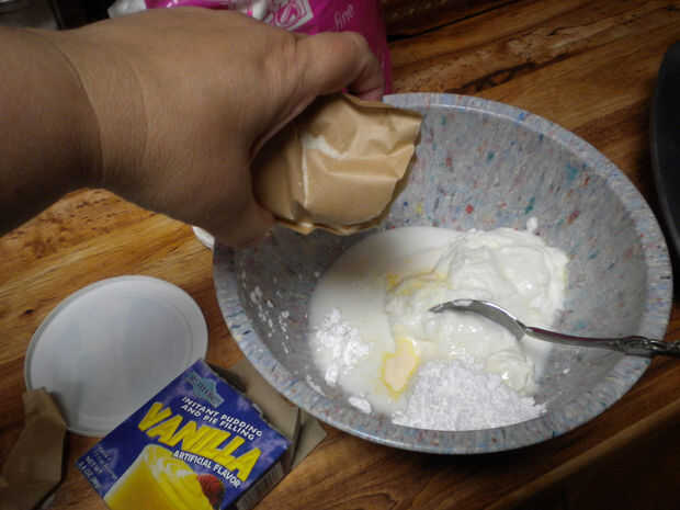 3. en un recipiente, combinar el queso crema, crema agria o yogur, azúcar, leche y pudín. Revuelva para mezclar y luego usar blender para hacer liso. Se trata de una mezcla espesa.