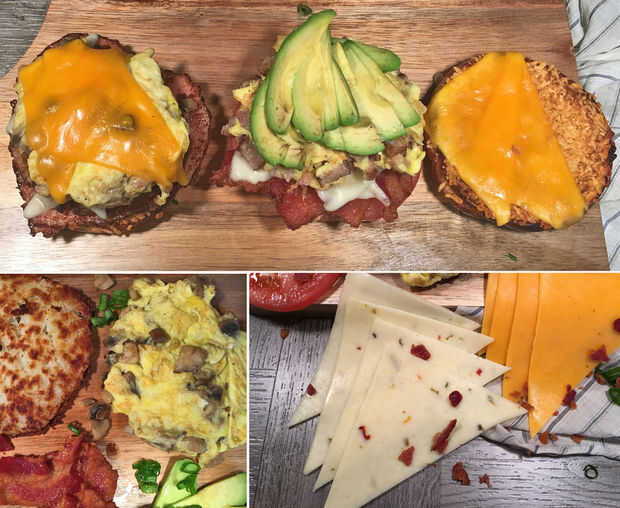 • Comenzar la pila superior con el medio pedazo de rollo de sandwich (estilo hecho de Cheezzy parmesano).
