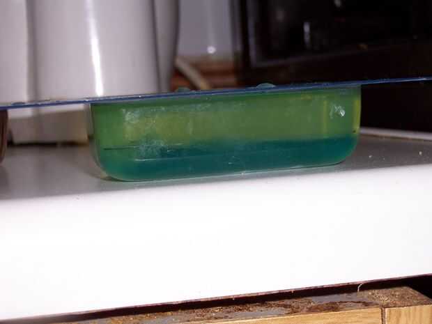 Vierta el jabón de color, con aroma de su molde y rocía inmediatamente la tapa con alcohol quirúrgico, esto reduce la tensión superficial y se deshace de las burbujas en la parte superior. Si tienes algunas burbujas muy pequeñas, como espuma alrededor del borde que sólo no desaparecen, el jabón era probablemente un poco demasiado caliente. No te preocupes, que aún funciona como jabón, solo trata de no calentar demasiado la próxima vez! Las burbujas no son realmente un problema funcional, pero tienden a estropear la estética de la barra de acabado.