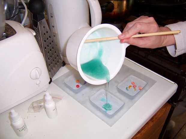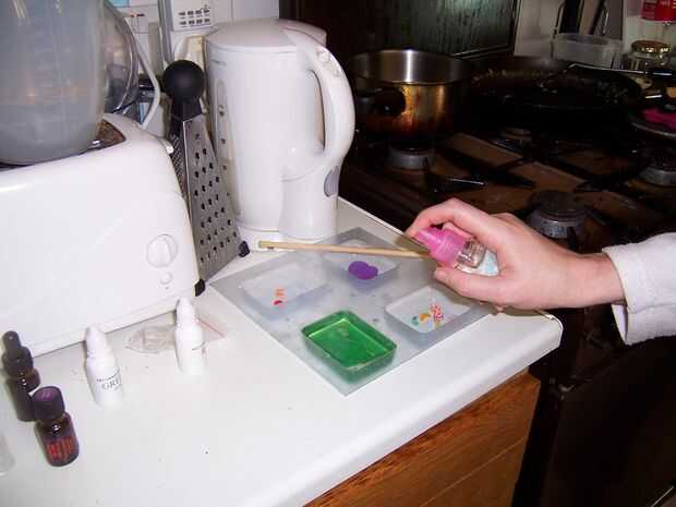 Después de verter y rociar, dejar el jabón donde está situado. Trate de no golpear al menos media hora, como el jabón forma una natilla-como la piel en la parte superior que se arruga si golpee. Una vez más, se seguirá funcionando, pero parece un poco extraño. Me parece que incluso pesadamente pisando las tablas del suelo inestables puede causar este problema, pues tenga cuidado y coloque el molde en un lugar seguro antes de verter el jabón.