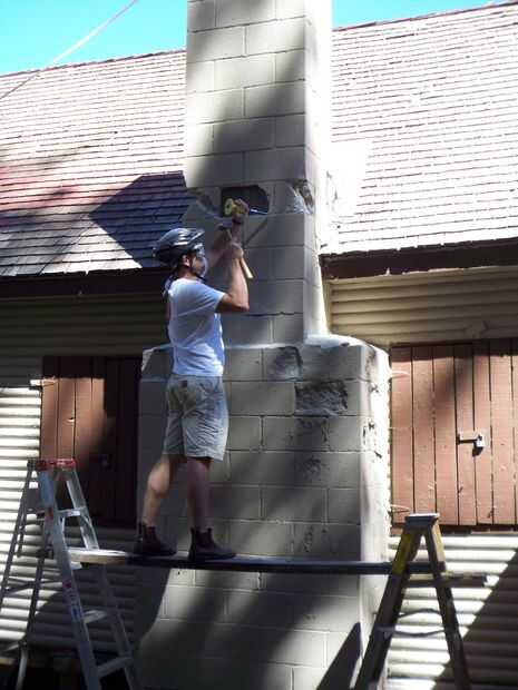 La chimenea de bloques de hormigón fue construida en 1950 con materiales de baja calidad y fue cayendo a pedazos. Condenado oficialmente. No utilizable. Peligro de incendio. Trozos de la misma se caen al suelo. La chimenea tenía que ir.