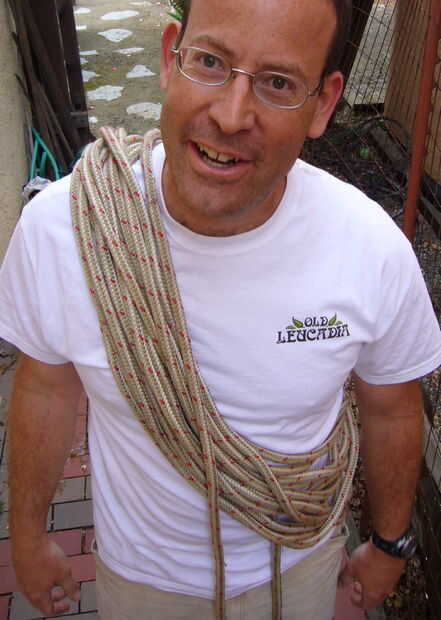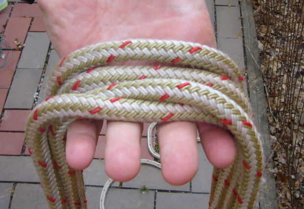 La cuerda es una línea de 'dinámica', lo que significa que se extiende mucho al cargar. No se estira un cable de acero o una línea 'static' (a diferencia de la cuerda que utilizamos). La línea de anclaje que utilizamos tiene una carga muy similar y las especificaciones de estiramiento a una cuerda de escalada. De hecho utilizamos esa misma cuerda para escalada en roca hace muchos años cuando no podía permitirse una cuerda de escalada adecuada. Creo que era $40 de West Marine alrededor de 1994. No estoy seguro del tamaño, pero puedes ver las fotos. Es fácil hacer buenos nudos con esta cuerda.