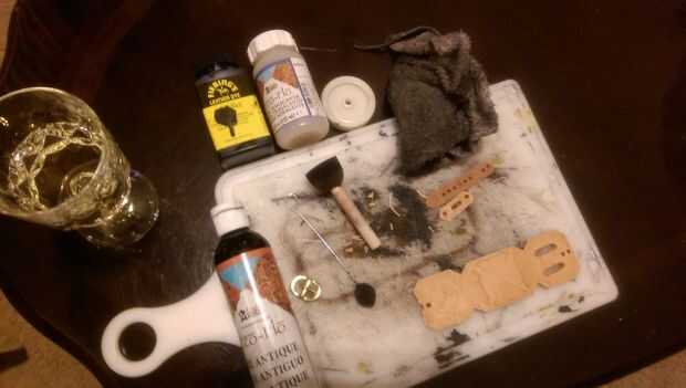 Para los lazos de la bala, un punzón oblongo de 3/4 de pulgada y perfore dos agujeros como muestra la imagen. Ahora usted puede tomar la base y las correas y teñirlos. Había teñido el soporte de la hebilla y correa negro sólido y había utilizado el gel antiguo caoba en la base del reloj. Buff todo, luego pulido sus bordes con una rueda impermeable y Goma tragacanto. Después de todo esto, cubrir todo con shene super. DEM BORDES DOE