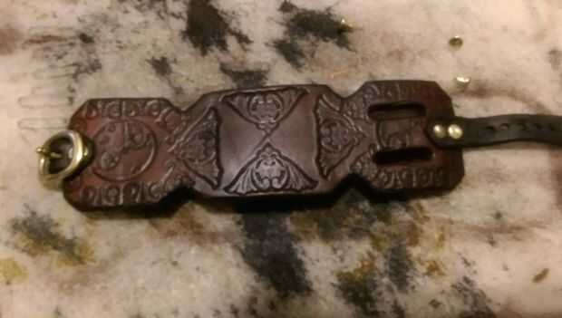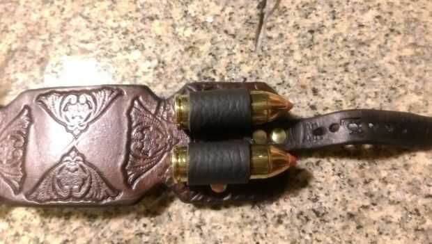 Después de todo se seca, coloque los remaches en su soporte de la hebilla y correa. A continuación, cortar una tira de aproximadamente 5.5 pulgadas de largo y 3/4 pulgadas de ancho para los lazos de la bala (asumiendo que está cabiendo balas de colt.45). Un remache en un lado y empezar a roscar el lazo de bala. Páselo a través de un agujero, sobre una bala y hacia abajo otra vez, luego hasta el siguiente hoyo, sobre otra bala y detrás otra vez. Tire de la correa agradable y apretado, luego corte el sobrante. Perfore los agujeros a través de la correa y la base y coloque el remache. Ahora que se hace!