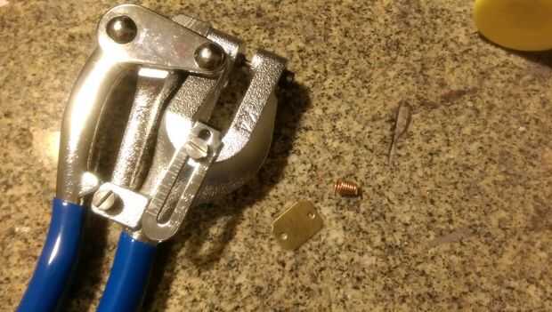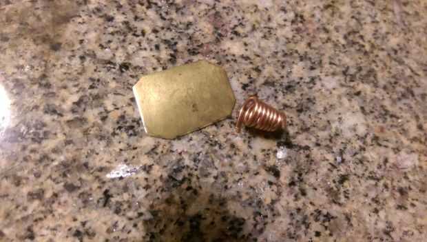 A continuación, corte un rectángulo de latón áspero 3/4 por 1 pulgada. Perfore agujeros en los extremos con un punzón de metal. Coloque el adorno para la placa de latón con soldadura o epoxi, dependiendo de su composición. Luego coloque la banda con remaches.