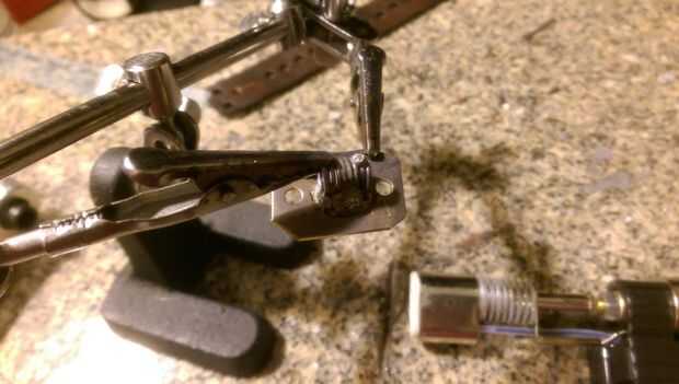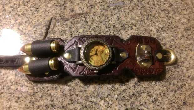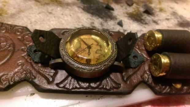 Ahora corte un par poco tiras de cuero de 1/2 pulgada de ancho y 1,5 pulgadas de largo. Doblarlas sobre los alfileres de la venda de reloj y hacer un agujero a través de ellos. Coloque esto en la banda y centro de todo, luego marque los agujeros de sacador hacia fuera. establecer sus remaches para fijar el mecanismo del reloj.