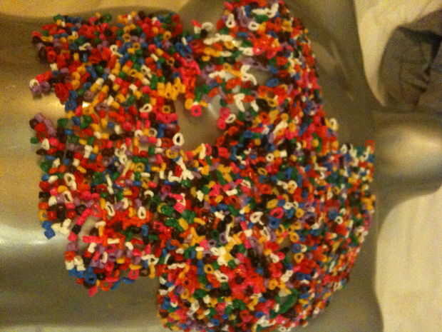 Pero mientras que los granos están derritiendo uso el utensilio de metal y madera para fusionar aún más, esto crea un efecto de mancha y también mantiene las cuentas más fuertes juntos cuando enfriado