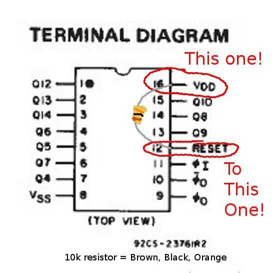 El chip es un CD4060 (etapa 14 ripple counter) en la mía. La utilizan como cuenta encima del contador de tiempo para apagar la CA a las bobinas del calentador después de dos horas. Alambré en una 10 k resistencia pullup a Vdd al pin 12 (master reset). Desactiva la función de contador y listo, no hay auto apagado!