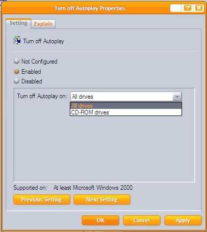 1. botón Inicio > Ejecutar > gpedit.msc > ok > configuración del equipo > Plantillas administrativas > Sistema > desactivar reproducción automática > Activar > todas las unidades > ok