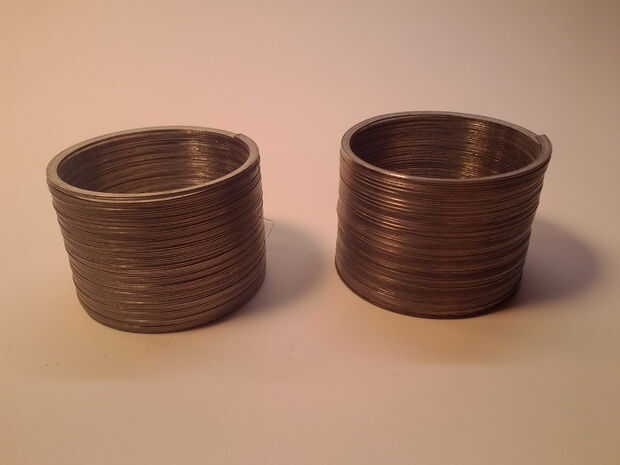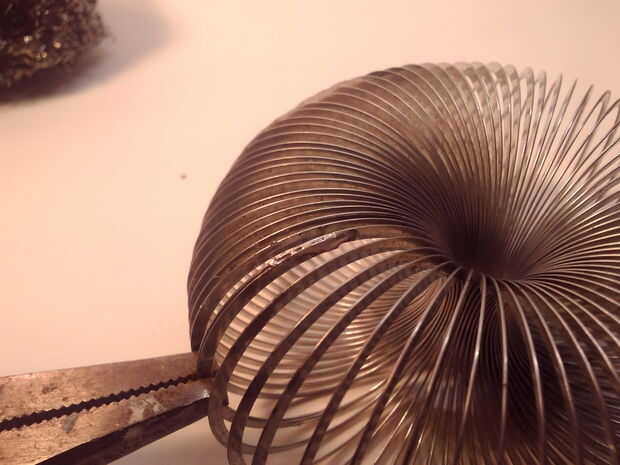 Me coloca el Slinky alrededor y cuidadosamente había alineada en los anillos de extremo para que se sobre traslapado para cerca de 30% de la circunferencia total. Atención aquí porque si no se suelda directamente se verá imperfecto más adelante. Cuando todo era recto usé un par de agarres de Vice y sujeta el cable firmemente. Soldar la Junta, prestando especial atención a hacer que los extremos lisos. Cuando la articulación comprueba bordes filosos que alisó hacia abajo con un trapo rápido de mi hierro. Repetí estos paso con la segunda Slinky y terminé.
