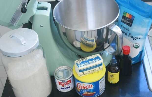 Crema manteca y mantequilla junto en un tazón mediano. Con una batidora en velocidad media, agregar azúcar en polvo y azúcar, un poco a la vez, hasta que quede suave. Añadir la leche evaporada, la vainilla y el extracto de limón. Continúe batiendo hasta que esponje.