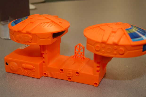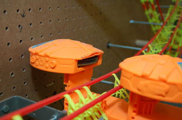 Me di cuenta que cuando yo corría mis coches de montaña rusa que algunos de ellos fueron restringidas por el plástico naranja de labios se extiende de los lados de los blásters. Usé la Sierra de cinta y una Dremel para quitar este borde para crear un mayor espacio a través del cual podían pasar los coches de la montaña. Esto no impacto la efectividad de los blásters.