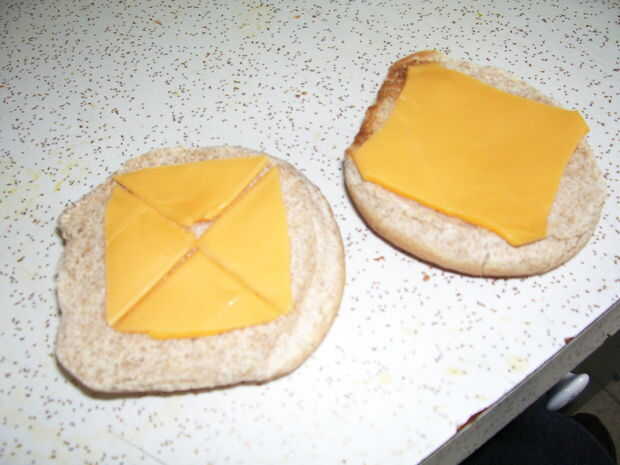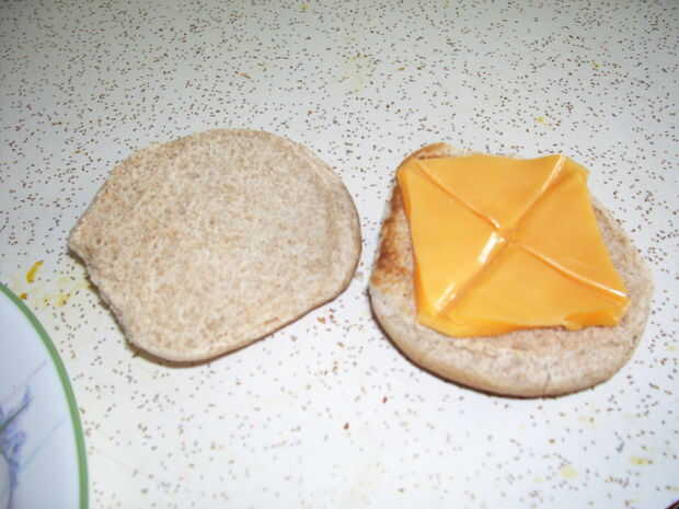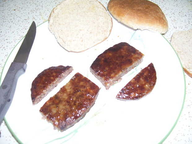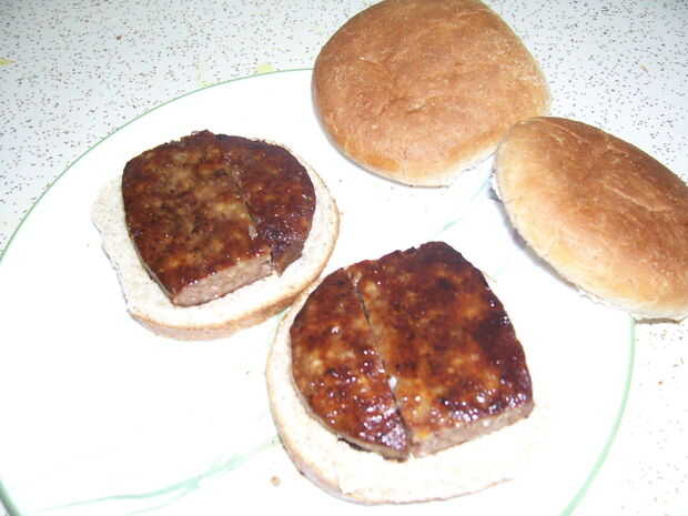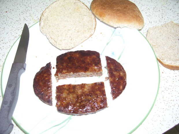 1. aquí está la solución para cortar una hamburguesa por la mitad y sigue recibiendo dos formas que encajan sobre el moño.