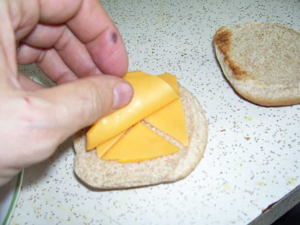 7 y 8. Darle la vuelta boca abajo. Despegue la parte superior y ponerlo en el otro pan.