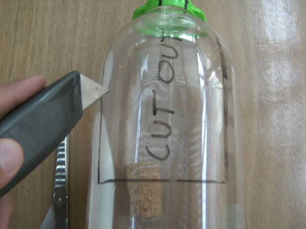 El desagüe se corta de la mitad superior de un lado de la botella. Utilizar un stanley / exacto cuchillo para cortes limpios y rectos.