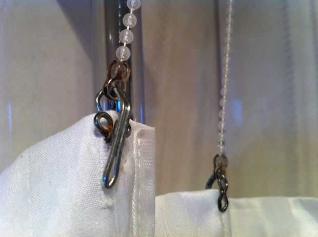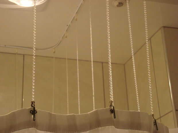 La "cadena de la bola" es realmente un traje cosas de Spotlight (almacén de cadena de suministro de costura) porque lo real era demasiado caro. Hice algunos cálculos y cortar tantas tiras como tenía agujeros de cortina (menos dos superposiciones). Tiene conectores de cadena de la bola de Mitre-10 Mega (una cadena de hardware) y había conectado a la cuerda en ambos extremos y Unidos ganchos de cortina. Hice las cuerdas de suspensión ligeramente colgado mucho tiempo, las cortinas de estos en la