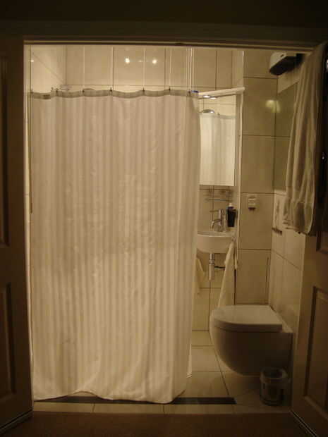 Usar dos cortinas de ducha comerciales estándar (ex-motel los) que se superponen por dos agujeros. Tengo tres pares de ellos, para que todos serían la misma longitud y número de agujero cuando les cambié. Siendo de segunda mano, eran relativamente baratos.