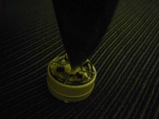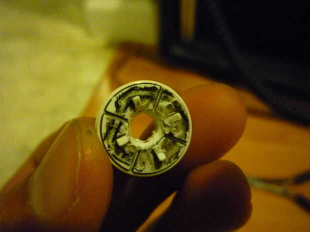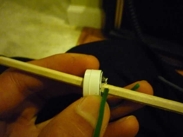 Hacer un agujero con su navaja de bolsillo (Foto 2) en el centro del tapón de marcador (que sacó antes) hasta que el palillo (Foto 3). En la primera foto se muestra el tamaño aproximado del agujero.