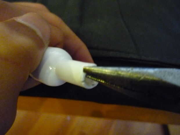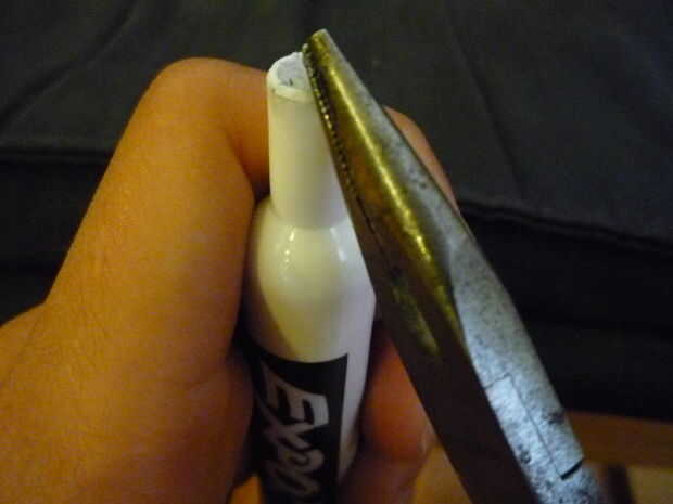 Con la punta de sus alicates, tome una pequeña sección de la parte delantera de la marcadora (Foto 1) y dóblelo hacia abajo. Si todavía no se ve como la foto 3 o 4, use el lado de los alicates para empujar la pestaña hacia abajo más (Foto 2)
