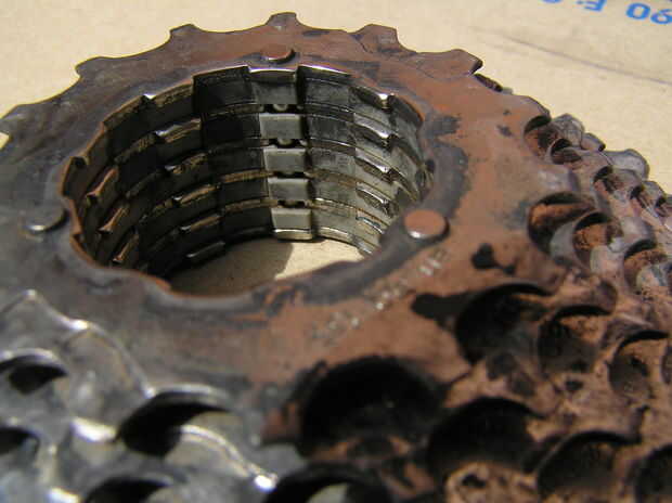 La parte con el piñón más pequeño / preparan, identificar los remaches sosteniendo todos juntos. En la mía hubo tres, pero dependiendo que llegar puede ser más. Si puedes elegir entre un par de grupos posteriores, ir a la una con la menor cantidad de estos remaches.