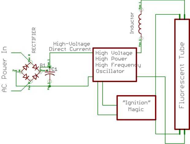 Para hacer que el Balastro más pequeño, tenemos que reducir de alguna manera el inductor. Puesto que la corriente es proporcional a la inductancia y la frecuencia, podemos hacer el inductor más pequeño sólo por aumento de la frecuencia! Básicamente, la electrónica en una CFL (o en un "balastro electrónico" para fluorescentes convencionales) contiene un circuito que alterna de frecuencia superior de la entrada normal de 60Hz.