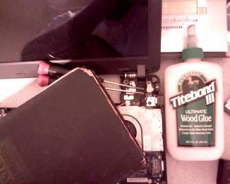 Finalmente, para mantener el módulo de entrada de DC en lugar, usar Titebond Wood glue. Utilizar su pegamento fuerte de elección. Solo le dan un montón de tiempo para secar. Coloqué dos puntas de destornillador en el módulo de entrada de CC para que se levante y alojarte presionado contra la pieza de metal sobre el que coloqué el pegamento. Utiliza un diccionario para mantener los destornilladores tensados para arriba y me fui a la cama.