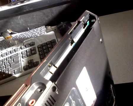 Ahora, del tirón Vaio a su lado para que puedan ver la parte inferior de la bahía de unidad de DVD ROM. Dentro de la bahía, hay tres tornillos pequeños. Necesitará desatornillarlos.