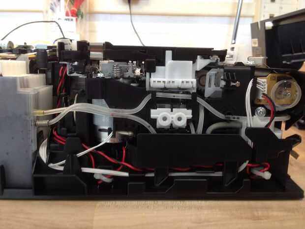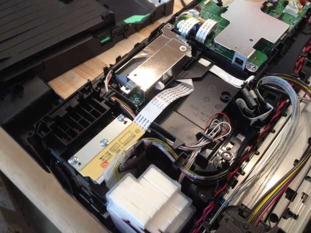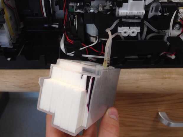 Se aprecia en estas fotos y que la impresora no dispensa directamente de los cartuchos de tinta. En su lugar bombea la tinta fuera de ellos y en el cabezal de impresión.