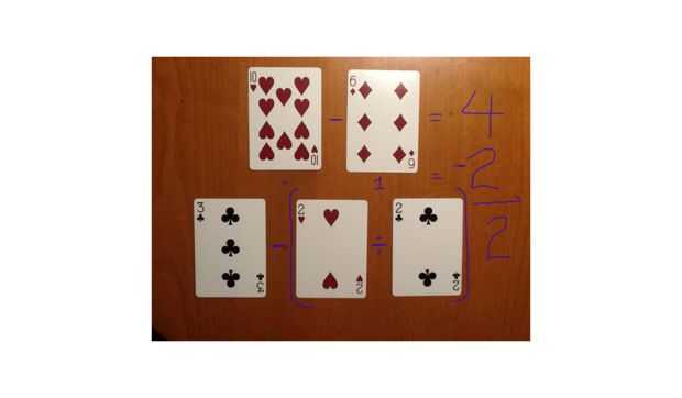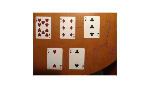 El objetivo: utilizar tantas tarjetas como sea posible para crear tantas ecuaciones como posible, pero sólo uso cada tarjeta una vez! Eso implica que desde una ecuación requiere al menos dos cartas, no más de dos ecuaciones pueden crearse en cualquier una mano. Es posible crear dos ecuaciones con cuatro o cinco tarjetas. Para nuestros propósitos, el jugador que utiliza la mayoría de las tarjetas para crear las ecuaciones la mayoría gana la ronda y recoge las cartas de los otros jugadores. Estos simplemente se amontonan a un lado para servir como una puntuación manteniendo el dispositivo.