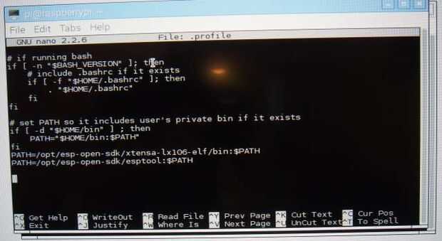 Ahora se instala el sdk de open de esp. Para utilizarlo, los archivos necesitan estar en su camino. Para hacer que usted puede editar el archivo /home/pi/.profile en un editor (foto) o sólo abra una terminal y escriba los comandos siguientes-