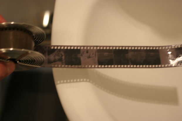 - Retire las película espirales desde el tanque de la luz de la habitación normal. Usted notará que la imagen negativa en el lado de la emulsión de la película.