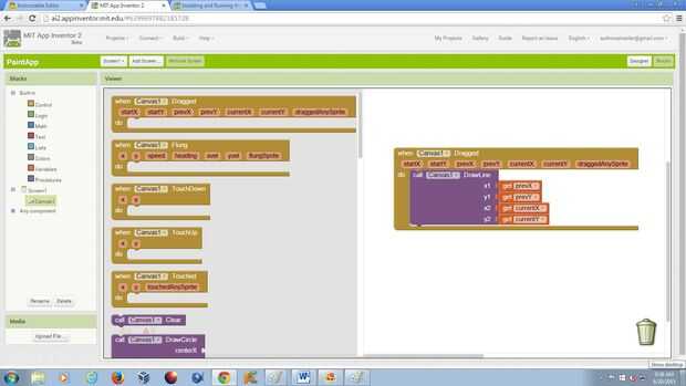 Una columna de bloques debe aparecer y haga clic en uno que dice "al Canvas1.Dragged" y que en el espacio blanco vacío. Luego haga clic en "Canvas1" otra vez pero de este desplazamiento de tiempo hacia abajo y seleccione "llamada Canvas1.DrawLine."