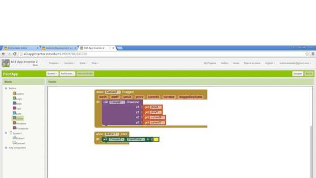 A continuación, haga clic en "Canvas1" y desplácese hacia abajo hasta que vea el script "Canvas1.PaintColor a" y arrastre que dentro la "cuando Button1.Click" secuencia de comandos.