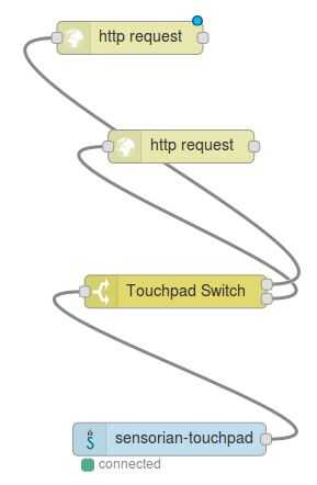 Dejar todo como está. Alambre el lado izquierdo de ambos nodos de solicitud http en las salidas del nodo Interruptor de Touchpad .