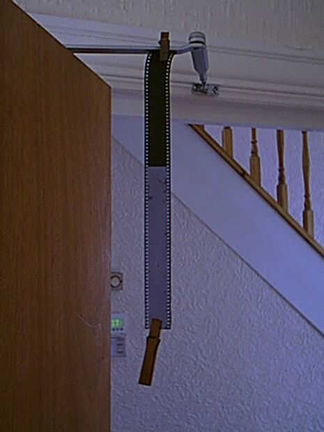 Saque el carrete de película del tanque en desarrollo y quite la película (esto puede hacerse girando el carrete de película hasta que se trabe y deben separar las dos mitades.) Tenga cuidado de mantener la película sólo por los bordes y encontrar un área libre de polvo de tu casa/habitación/dirigible no rígido y con unas pinzas, peg a la película a secar, también poner una clavija en la parte inferior de la película, esto debería ayudar a mantenerlo recto y detenerlo acurrucándose.